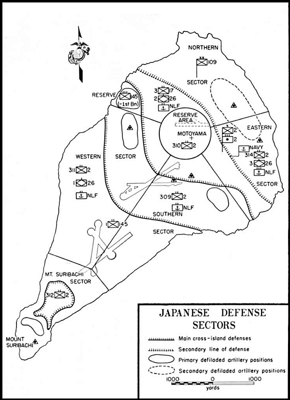 But the battle was beginning to take its toll on the Japanese garrison as well. General Tadamichi Kuribayashi knew his 109th Division had inflicted heavy casualties on the attacking Marines, yet his own losses had been comparable. The American capture of the key hills in the main defense sector the day before deprived him of his invaluable artillery observation sites. His brilliant chief of artillery, Colonel Chosaku Kaido, lay dying. On this date Kuribayashi moved his own command2 post from the central highlands to a large cave on the northwest coast. The usual blandishments from Imperial General Headquarters in Tokyo reached him by radio that afternoon, but Kuribayashi was in no mood for heroic rhetoric. “Send me air and naval support and I will hold the island,” he signalled. “Without them I cannot hold.”