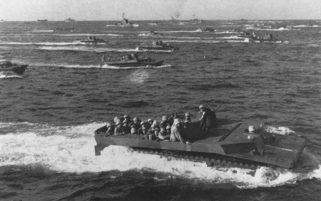 The planes had barely disappeared when naval gunfire resumed, carpeting the beach areas with a building crescendo of high-explosive shells. The ship-to-shore movement was well underway, an easy 30-minute run for the tracked landing vehicles (LVTs). This time there were enough LVTs to do the job: 68 LVT(A)4 armored amtracs mounting snub-nosed 75mm cannon leading the way, followed by 380 troop-laden LVT 4s and LVT 2s. The waves crossed the line of departure on time and chugged confidently towards the smoking beaches, all the while under the climactic bombardment from the ships. Here there was no coral reef, no killer neap tides to be concerned with. The Navy and Marine frogmen had reported the approaches free of mines or tetrahedrons. There was no premature cessation of fire. The “rolling barrage” plan took effect. Hardly a vehicle was lost to the desultory enemy fire.