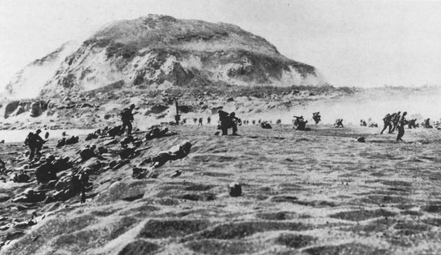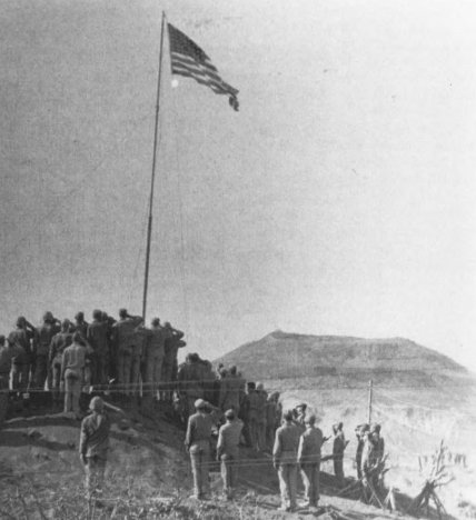 5th Division Marines land on Red and Green Beaches at the foot of Mount Suribachi under heavy fire coming from enemy positions overlooking the black sand terraces. The 28th Marines had not yet wheeled to the left towards Suribachi.