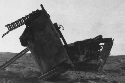 The first obstacle came not from the Japanese but the beach and the parallel terraces. Iwo Jima was an emerging volcano; its steep beaches dropped off sharply, producing a narrow but violent surf zone. The13 soft black sand immobilized all wheeled vehicles and caused some of the tracked amphibians to belly down. The boat waves that closely followed the LVTs had more trouble. Ramps would drop, a truck or jeep would attempt to drive out, only to get stuck. In short order a succession of plunging waves hit the stalled craft before they could completely unload, filling their sterns with water and sand, broaching them broadside. The beach quickly resembled a salvage yard.