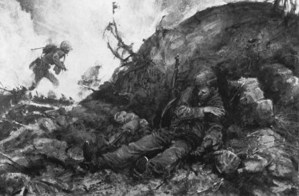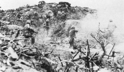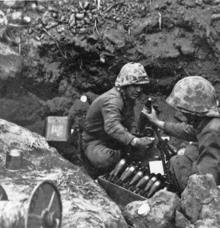 The ensuing bombardment was as deadly and terrifying as any of the15 Marines had ever experienced. There was hardly any cover. Japanese artillery and mortar rounds blanketed every corner of the 3,000-yard-wide beach. Large-caliber coast defense guns and dual-purpose antiaircraft guns firing horizontally added a deadly scissors of direct fire from the high ground on both flanks. Marines stumbling over the terraces to escape the rain of projectiles encountered the same disciplined machine-gun fire and mine fields which had slowed the initial advance. Casualties mounted appallingly.