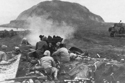 The naval bombardment had already begun and I could see the orange-yellow flashes as the battleships, cruisers, and destroyers blasted away at the island broadside. Yes, there was Iwo—surprisingly close, just like the pictures and models we had been studying for six weeks. The volcano was to our left, then the long, flat black beaches where we were going to land, and the rough rocky plateau to our right.