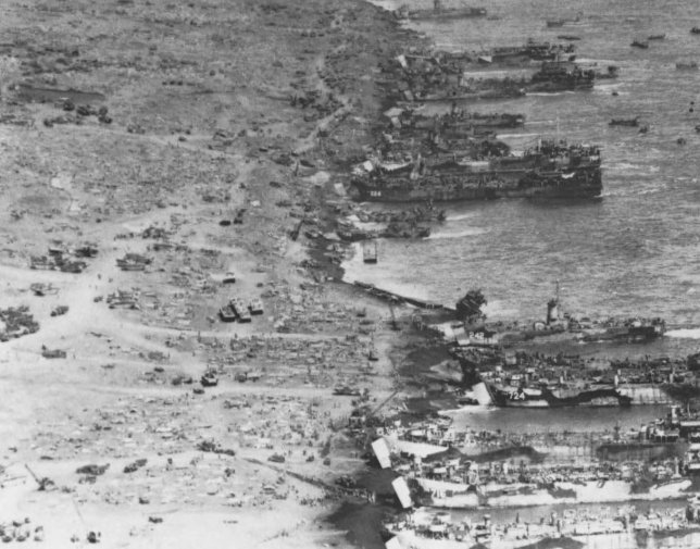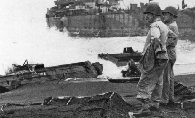 As soon as it hit the beach on the right side of the V Amphibious Corps line, the 25th Marines was pinned down by accurate and heavy enemy fire. Meanwhile, landing craft, supplies, and vehicles pile up in the surf behind Marines.