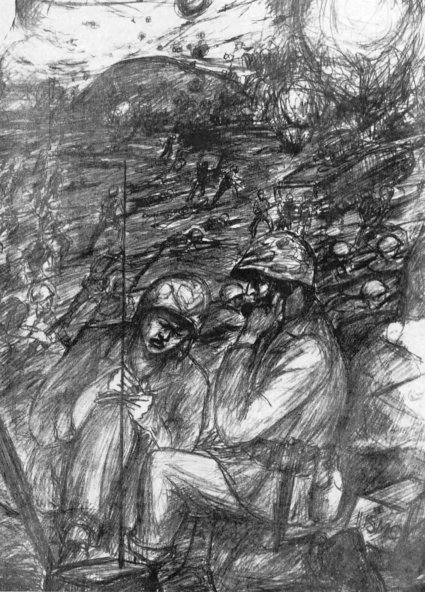 To the east the 4th Marine Division had finally captured Hill 382, ending its long exposure in “The Amphitheater,” but combat efficiency had fallen to 50 percent. It would drop another five points by nightfall. On this day the 24th Marines, supported by flame tanks, advanced a total of 100 yards, pausing to detonate more than a ton of explosives against enemy cave positions in that sector. The 23d and 25th Marines entered the most difficult terrain yet encountered, broken ground that limited visibility to only a few feet.