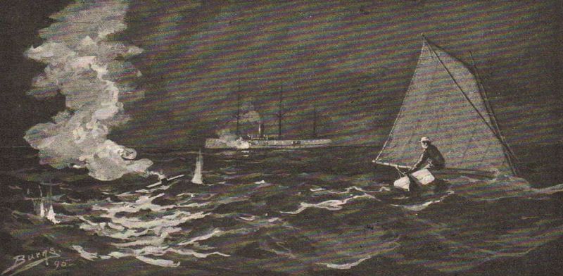 He was still running out seaward and eastward, and the sharpie was bending down to her work, and cutting the waves like a knife, when suddenly he heard the throbbing of an engine and the splash of a propeller. Before he had time to think a great black wall of iron, looming twenty feet above his head, was right on top of him.