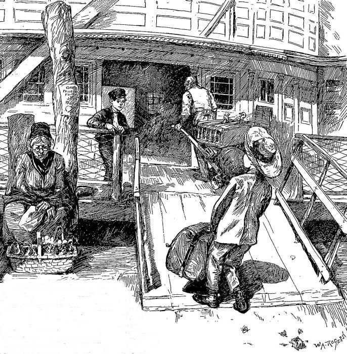 Therefore Tim had an opportunity to take in all the details of the interesting scene. The deck hands were scurrying to and fro, wheeling in freight or baggage on funny little trucks with very small wheels and very long handles; passengers were running around excitedly, as if they thought they ought to attend to matters which did not concern them; newsboys were crying the latest editions of the papers; old women were trying to sell fruit that did not look very fresh, and everything appeared to be in the greatest confusion.