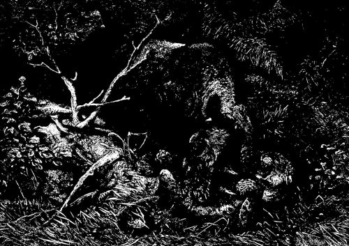In cold climates the raccoon lies dormant in the winter, only venturing out on occasional mild days; but in the Southern States he is active throughout the year, prowling about by day and by night in search of his food, inserting his little sharp nose into every corner, and feeling with his slender paws between stones for spiders and bugs of all kinds. He spies the innocent frog with his head just out of the water, and pouncing upon him, he dispatches him without a moment's warning. There seems to be no limit to his rapacity, for he is always eating and always hungry. The print of the raccoon's paw in the mud or snow is easily recognized, much resembling the impression made by the foot of a babe.