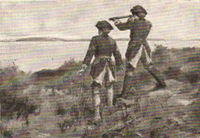 "I was rather frightened at first, I take it," said Carter. "But I tell you it was grand to see the way they landed. Just across the river were the batteries on Copps Hill. The guns were firing at us, and the cannon-balls howled over our heads or threw up the sand all about us. I was in the earth-works, and off to one side stretched a line of rail fence; before it had been piled new-cut hay, making a breastwork like a great windrow. Behind it crouched our men in double line. When the 'redcoats' from the boats landed we could see the officers running up and down the lines, flourishing swords and shouting and pushing the men into place here and there. I tell you, George, they are brave men, no matter if we do call them 'tyrants.' They came up the hill with their drums beating, and were so close that we could hear their tramping, and ahead of them all was Howe. We fired into them. They went down like nine-pins, and some lay so close to us that we could hear the groaning. But talk of excitement! It was frightful. You seem to act without knowing what you do. Many of our greenhorns forgot to fire, and put in one load on top of the other. Did you know that men shout and scream in battle as if they were wild Indians? It's a strange sound, I can tell you. Probably you will hear it before long."