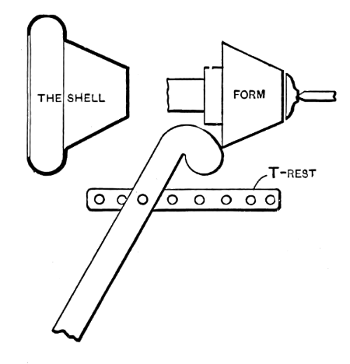 In starting to spin a difficult shell it sometimes happens that the[9] necessarily small follower will not hold the blank. To prevent this slipping, the face of the follower is covered with emery cloth. Often, however, on rough work, the spinner will not stop to face the follower, but will make a large shallow dent at the center of the blank; the extra pressure required to force the metal against the form will usually overcome the slipping tendency.