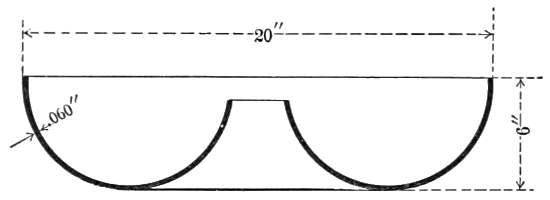 As another example of metal spinning, assume the shape shown in Fig. 13. The shell is to be 20 inches in diameter, 6 inches deep, and 0.060 inch thick. The metal to be used is zinc. This is an interesting metal spinning job, and not a particularly difficult one. The shell can be best spun with the aid of two spinning forms, such as are illustrated in Figs. 14 and 15. These forms should be made of kiln-dried maple if there are comparatively few shells to be spun. If there are many, the forms should be made of cast iron. Fig. 14 shows the first form to be used, which conforms to the outside of the shell as far as the centers of the spherical ring. Beyond these points, the form is straight. The blank to be spun is placed as indicated by the dotted lines, and follower No. 1 is used to hold the work against the form. The chief trouble will be met in properly starting the shell, because of the small follower that must be employed. However, follower No. 2 may be substituted after working the metal back against the form a few inches, and as this gives a better grip on the shell, there will be no further danger of slipping. After spinning the zinc shell to the shape of the first form (Fig. 14) it will probably have to be annealed, but this can only be determined by trial. In annealing zinc, the flame should not be allowed to touch the metal. The half completed shell is then put on form No. 2 shown in Fig. 15. It is an easy matter to spin the metal round to complete the arc. The dotted line shows the position of the shell before starting the last part of the spinning. Of course, it will be understood[14] that the shell must be trimmed several times during the spinning, and if the trimming is frequently done, a well-shaped shell should result. For spinning on form No. 2, follower No. 3 must be used. Either beeswax or soap should be frequently rubbed over the work while spinning. If it is necessary to cut out the center, it can be done before removing the shell from the last form by simply removing the follower and using a diamond point tool, or in large product work the swivel cutter will work well. The shell will cling to the form without the follower. The spinning speed should be from 800 to 1,000 R. P. M.