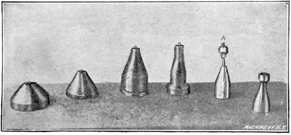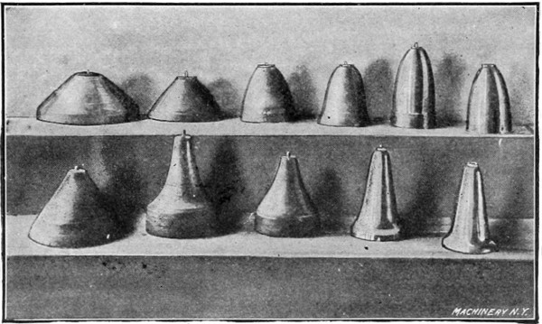 In Fig. 22 two finished brass shells are shown to the right, and also the number of operations required to change the form of the metal. The upper shell is 6 inches long and 3½ inches in diameter at the large end, while the lower one is 7¼ inches long by 3¾ inches in diameter. It was necessary to anneal these shells between each operation, the upper shell being annealed four times and the lower one three times. These pieces were made in quantities sufficient to warrant the making of chucks for each operation, which enabled them to be spun with less skill than would be required if a finishing chuck only were made. When a single finishing chuck is used, the various operations in spinning a shell of this kind would be left to the judgment of the spinner, who would decide the limit of the stretch of metal between the operations before annealing.