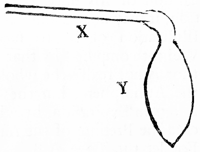 The Pressure of the Atmosphere on the internal Surface of the Lungs, as computed in the foregoing Pages, so much exceeding that made by the ingenious Dr. Kiel, in the last Edition of his Book of Animal Secretion, it may not be amiss for the farther Illustration of it, to show that the Weight computed by that Learned Author is not really the whole Pressure of the Atmosphere, but the Force of the Lungs in Expiration, by which they exceed the Pressure of the Air upon them. For let the Tube A B be inserted into the Vessel C D E F of any given Dimension, and both the Tube and Vessel fill'd with Water or any other Fluid, it is evident from the Writers in Hydrostatics, that the Vessel [pg 62] C D E F will be pressed upon on every Part of its Internal Surface equal to the Basis of the Tube, by the Weight of a Column of the contained Fluid of the same Height with the Fluid, and whose Base is equal to that of the Tube, and consequently every Inch Square on the Internal Surface of the Lungs will be pressed upon by a Column of Air, whose Height is equal to that of the Atmosphere, and base one Inch Square, which will amount to the aforesaid Sum. Vide Pag. 34 & 35. Now if we suppose the Tube X inserted into the Neck of the Bladder Y and the Air forced into the Bladder in Expiration, to an equal Density with that of the incumbent Atmosphere, it is evident that the Air will not go out by the Tube without some external Force, being in Æquilibrio with the Atmosphere, and consequently the Force by which it is expressed thro' the Tube, must be that by which it exceeds the Pressure of the Atmosphere, upon the Orifice of the Tube.