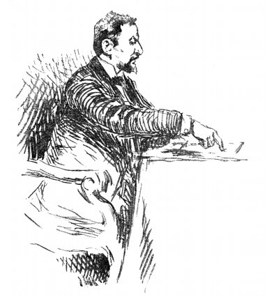 Tre giorni appresso risaliva quella cattedra un altro bell'ingegno, il Molmenti. Un artista che vuol essere aristocratico succedeva al più democratico di tutti i conferenzieri; alla naturalezza del fiorentino all'antica, seguiva la raffinata eleganza d'un cortesan veneziano. [xxiv] L'onorevole Molmenti non se l'abbia a male: il paragone non ha nulla d'odioso per lui; tanto è vero che posson farlo i lettori, raffrontando i ritratti dei due dicitori dovuti alla elegante matita del Corcos.