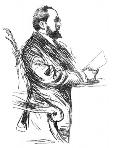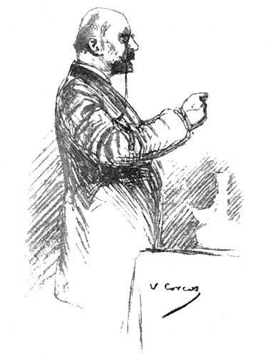 Tre giorni appresso risaliva quella cattedra un altro bell'ingegno, il Molmenti. Un artista che vuol essere aristocratico succedeva al più democratico di tutti i conferenzieri; alla naturalezza del fiorentino all'antica, seguiva la raffinata eleganza d'un cortesan veneziano. [xxiv] L'onorevole Molmenti non se l'abbia a male: il paragone non ha nulla d'odioso per lui; tanto è vero che posson farlo i lettori, raffrontando i ritratti dei due dicitori dovuti alla elegante matita del Corcos.