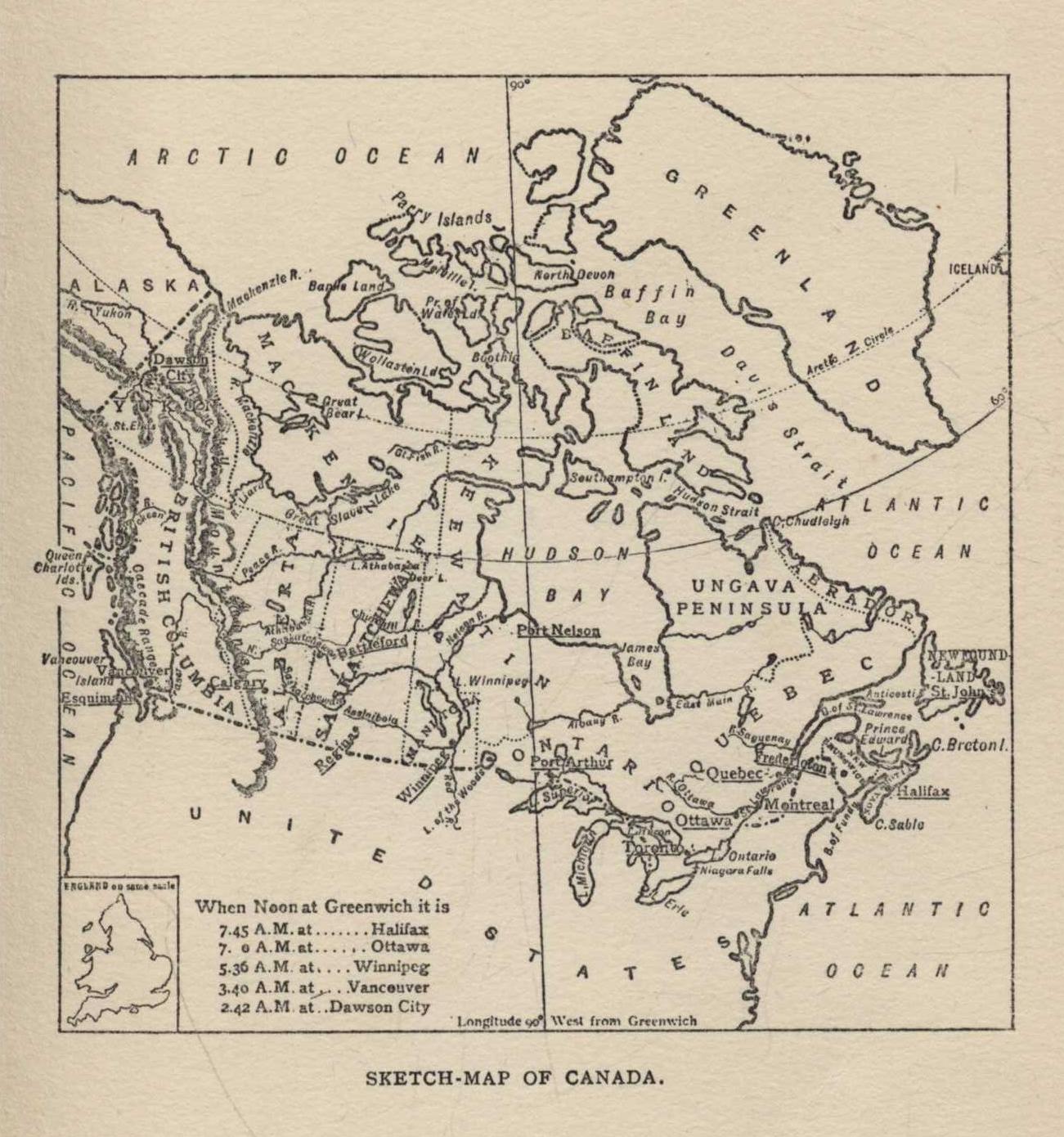 We will try to give our readers a few pictures of this new land. A country whose southern parts are in the same latitude as Marseilles, and whose northern islands hide in the everlasting silence of Arctic ice, naturally presents a great variety of physical features, climate, productions, and occupations, and this bewildering variety is increased by difference in age. Down in the east the Tercentenary last year marked the passing of 300 years since Champlain first landed; in the north and west it is rare to find a native born.