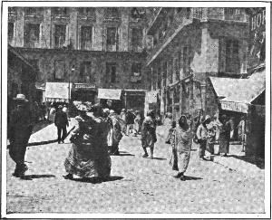 From the entrance to the harbor Algiers appears like a white diamond set in a circle of emeralds. The town consists of two parts, the French and the Arab quarters. To the visitor from the west Algiers is most interesting; for there he meets characters of all kinds, European peoples mixing with those of North Africa. The French quarters show that the Frenchman, when compelled to live in another country, takes a bit of Paris with him; for there is found the typical French café, with its little tables on the sidewalk, contrasting with the Arab café where natives, in their picturesque white costumes, sit and sip their coffee and gossip with wild gesticulation. Even in its African population Algiers is oddly mixed. Each tribe has its own peculiar costume, the marketplace often looking like a stage of a comic opera, only much more artistic and natural.