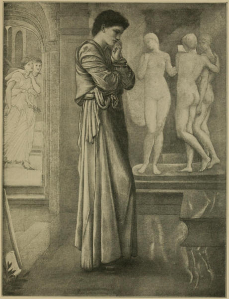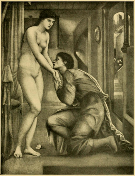 "The four pictures from 'The Story of Pygmalion,'" he writes, "also included in The Earthly Paradise, again show this preference of the poet and the artist for the spirit before the form, provided only the last be beautiful. The first, 'The Heart Desires,' is the idealization of unsatisfied longing for the unknown. Pygmalion, a tall, dark-haired young man, in a long garment falling in straight folds to his feet, stands brooding on life's emptiness in the vestibule of his house. A sculptured group of the Three Graces denotes his profession and at the same time typifies the cold beauty of artifice, the beauty of the mind, while two girls, seen through the open door, speeding along the street in the artless embrace of innocent maidenhood, represent the beauty of the body and the love that waits his winning; but in neither finds he consolation. In the second, 'The Hand Refrains,' the days of long labor are ended, and the artist's ideal, the cold, pure figure of the yet soulless image stands finished on the still rough pedestal, surrounded by flakes and chips of marble and implements of the sculptor's craft, while Pygmalion, chisel and mallet in hand, stays gazing in awe at the marvel his hand has achieved, his eyes content, but his soul still hungering. Outside the window behind him women go about their daily business in the city street, and through another casement, in a recess between him and the image, is a glimpse of a garden and a spurt of water falling into a marble basin—the constant dropping that wears away the stone, as his constant prayers shall move the goddess Venus to a miracle on his behalf. The third bears the motto, 'The Godhead Fires.' Into the sculptor's chamber, silent and solitary, while Pygmalion is away in the temple, floats lightly the Queen of Love, clad in a soft, transparent robe, flower-crowned and bearing a branch of myrtle, emblem of marriage rites, her feet brushed and environed by the white wings of her favorite doves. Towards her, leaning both arms on one uplifted from the goddess's side, an exquisite piece of composition, the awakening image stoops from the carved capital, blossom-strewn by the adoring Pygmalion, her eyes raised in awe up to the goddess, who with fixed gaze and pointed finger inspires her with the Promethean fire of life. Lastly, 'The Soul Attains.' Heart and soul are alike satisfied. Pygmalion kneels, looking up in trembling worship at the beautiful creature who lingeringly yields him her hands, though she still gazes out beyond him in dumb amazement at the mystery of consciousness that has suddenly been born in her. Marble no longer, but not yet altogether woman."