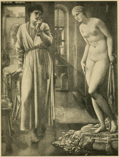 "Why should I strive to set the crooked straight?" he writes. How far this feeling was shared by Burne-Jones we can never know, but nearly all of his biographers are agreed that a love of beauty, as he understood it, was his main preoccupation, or, to use his own words, that a picture should be a "beautiful, romantic dream." Julia Cartwright, in her Life and Work of Sir Edward Burne-Jones, says: "He never tried to point a moral or to teach a lesson; but he rescued beauty from the forgetfulness to which it seemed doomed in a restless and material age, and in so doing has given us an example of the highest value." Malcolm Bell, also, writing of the art of Burne-Jones and of its critics, expresses a like opinion, and his analysis of the paintings composing the Pygmalion Series is not only interesting in itself, but is especially so as showing the extent to which the man of letters can read his own interpretation into the work of a painter.
