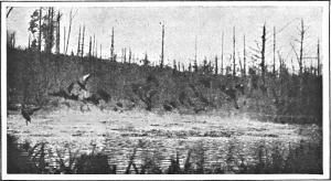 Still plentiful in spite of many thousand guns aimed at its life, the grouse ranges over the whole of northern North America, making short migrations in search of food or winter quarters. Sometimes when wintering in tall timber it eats great quantities of laurel buds; which, gunners say, makes the flesh highly poisonous for food. The survival of this game bird in such great numbers is due in a large measure to the whir of its flight, which serves a double purpose, startling the gunner and warning all other birds in the neighborhood. Some sportsmen never become accustomed to the sound; but are always unnerved and powerless to shoot the bird that makes it. One gunner, after having stood paralyzed before each grouse as it started up near him and whirred away out of range, roused himself with a desperate effort, and as the next thundered away brought the gun to his shoulder, shouting “Bang!” at the top of his lungs, while the grouse sped on unharmed.