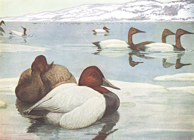 No longer ago than 1850 canvasbacks hovered in interminable flocks about Chesapeake Bay. Over ten thousand people were accustomed to shoot there. These ducks were then plentiful in all first class restaurants and hotels of the East. The glories of Chesapeake Bay as a shooting ground have largely departed, and canvasback ducks are now rarely seen on tables where they formerly appeared often; but there is still a stock of breeding birds left, and with adequate protection it will be long before we see the last of the species. So far as I know, no one has as yet succeeded in breeding this bird in captivity. Therefore we cannot depend on artificial propagation; but must protect the stock of wild birds.