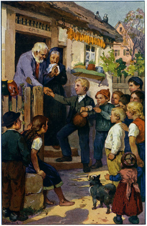 Unten sprach der Stallmeister mit dem Pferd, und während der Diener die beiden Buben vom Staub reinigte, lief das Pferd hinaus und kam wieder und – – brachte eine riesengroße Zuckertüte. Die legte es vor Heine Peterle nieder, dann kehrte es wieder um, lief noch mal zurück, kam noch mal wieder und brachte eine zweite Zuckertüte für den dicken Friede.