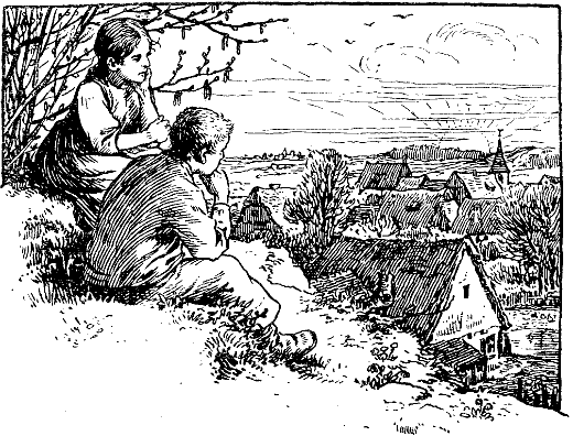 Als Traumfriede sich dem Häuslein der Muhme Lenelies, seiner Pflegemutter, näherte, sah er am Zaun dort Waldbauers Mariandel stehen. Das Mädel war vorangelaufen, um mit seinem guten Kameraden noch ein Weilchen zu schwatzen, und eifrig kam es ihm entgegen und erzählte, die Muhme habe Besuch, und mit dem Abendbrot sei es noch nicht so weit. Da liefen die Kinder den kleinen Nußberg hinauf, der über dem windschiefen Häuslein der Muhme anstieg, und oben setzten sie sich unter einen Haselbusch, der erst winzige, feine Blättchen hatte, und sprachen von Friedes künftigem Leben.