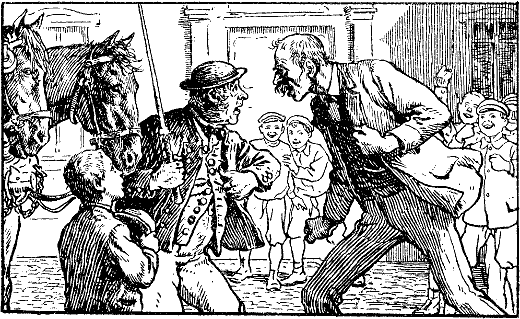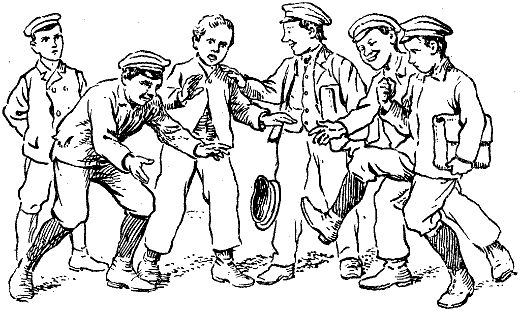 »Potzhundert noch mal, diese Rasselbande!« schalt Kaspar auf dem Berge wütend. Er kletterte vom Bock und brachte das verwirrte Geschirr in Ordnung; dabei sah er Friede ingrimmig an und schrie: »Mit der Rasselbande meine ich deine lieben Kameraden, Musjeh! Nä, sag mir mal, was haben die vor Tau und Tag im Straßengraben zu sitzen und so'n Geschrei zu machen?«