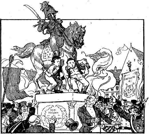 »Aber Kinder, 's ist nur Spaß!« Der Professor konnte kaum noch vor Lachen. Traumfriede tröstete: »Aber seid doch still, seid doch still!« Fräulein Wunderlich nahm gleich zwei heulende Mädel auf den Schoß. Muhme Lenelies wußte nicht, um wie viele sie schützend236 die Arme breiten sollte. Die Nachbarn beruhigten: »Kinder, Kinder, es ist ja nur ein Scherz!« Doch das half alles nichts. Die Kinder brüllten, als ob sie alle miteinander gebraten werden sollten. Selbst Füchslein, das doch die Sache kannte, brüllte mit. Nur Heine Peterle brüllte nicht, der zeigte, was ein echter Held in der Welt ist. Trapp, trapp – polterte er auch die Stufen hinab, dem Pferde nach, und urplötzlich fühlte sich das so fest am Schwanz gepackt, daß es den dicken Friede erschrocken fallen ließ und der in den Sand der Reitbahn kollerte.