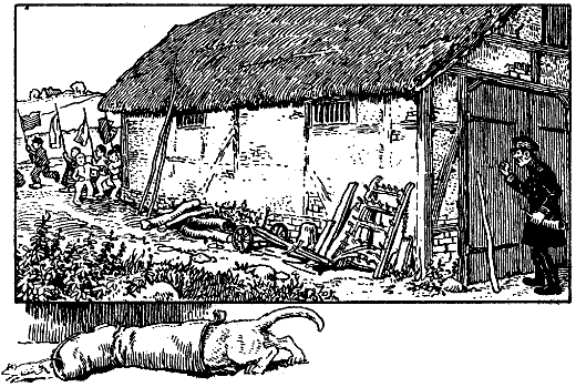 »Komm bald wieder!« brüllten ihm alle nach. Da drehte er sich wie ein Rad und stand wieder auf den239 Beinen und quiekte mit ganz hoher, dünner Fistelstimme: »Ach nein, jetzt muß ich mich bei meiner Mutter in einen Pflaumenmußtopf schlafen legen, lebt alle wohl!«