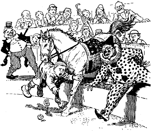 »Kriech nur wieder unter die Bank,« rieten die Kinder hilfsbereit, obgleich den Mädeln das Kasperle so in der Nähe recht unheimlich war. Aber da war schon das Pferd und – schnapp – hatte es den Clown am Hosenboden gepackt und trug ihn nun die Treppe hinab. Unten rollten die Diener eine große Tonne herbei, und o Entsetzen! das Pferd steckte Kasperle in die Tonne. Eine Zuckertüte gab's nicht.