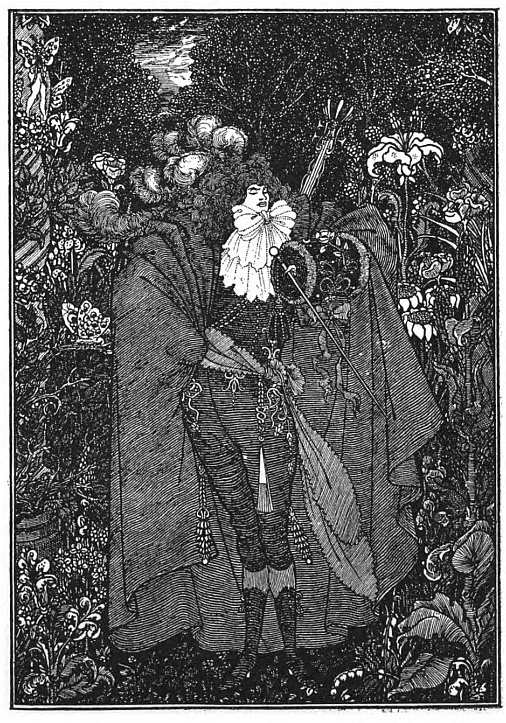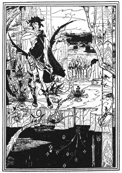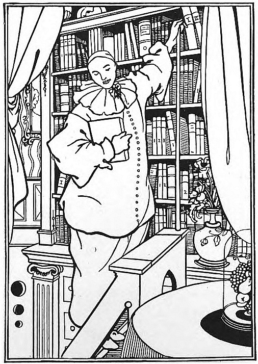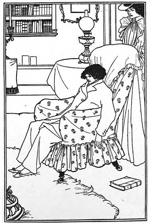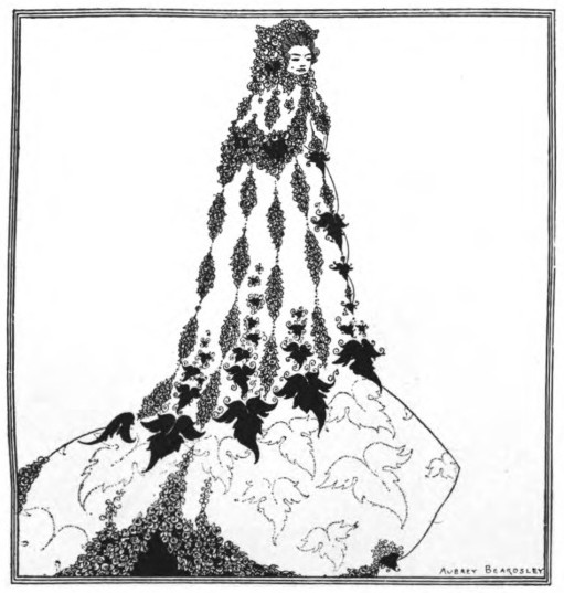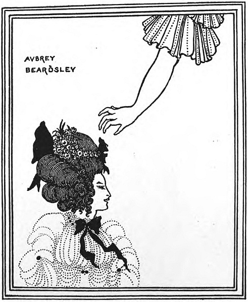 And Beardsley, with almost more than the Parisian's deference to Paris, and to the moment, was, more than any Parisian, this Pierrot gamin. He was more than that, but he was that: to be that was part of what he learnt from France. It helped him to the pose which helped him to reveal himself: as Burne-Jones had helped him when he did the illustrations to the "Morte d'Arthur," (Ill. 7-10) as Japanese art helped him to free himself from that influence, as Eisen and Saint-Aubin showed him the way to the "Rape of the Lock." (Ill. 53) He had that originality which surrenders to every influence, yet surrenders to absorb, not to be absorbed; that originality which, constantly shifting, is true always to its centre. Whether he learnt from M. Grasset or from Mr. Ricketts, from an 1830 fashion-plate, or from an engraved plate by Hogarth, whether the scenery of Arques-la-Bataille composed itself into a pattern in his mind, or, in the Casino at Dieppe, he made a note of the design of a looped-up window-blind, he was always drawing to himself, out of the order of art or the confusion of natural things, the thing he wanted, the thing he could make his own. And he found, in the French art of the moment, a joyous sadness, the service to God of Mephistopheles, which his own temperament and circumstances were waiting to suggest to him—.