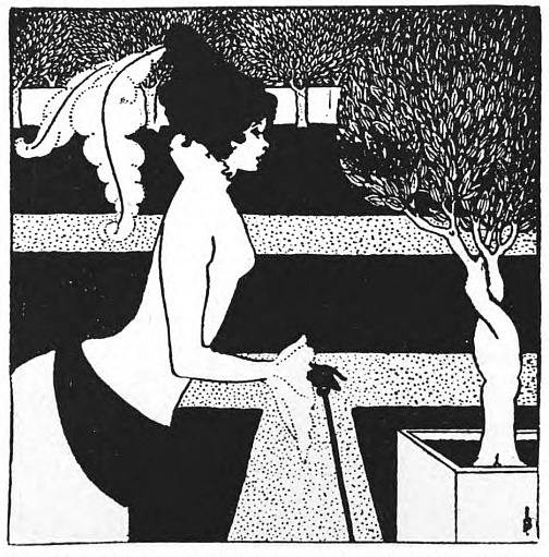 In the "Salomé" (Ills. 15-29) drawings, in most of the "Yellow Book" (Ills. 33, 34, 35, 37, 40, 41) drawings, we see Beardsley under this mainly Japanese influence; with, now and later, in his less serious work the but half-admitted influence of what was most actual, perhaps most temporary, in the French art of the day. Pierrot gamin, in "Salomé" itself, alternates, in such irreverences as the design of "The Black Cape," (Ill. 17) with the creator of the noble line, in the austere and terrible design of "The Climax," (Ill. 24) the ornate and vehement design of "The Peacock Skirt." (Ill. 16.) Here we get pure outline, as in the frontispiece; a mysterious intricacy, as in the border of the title-page and of the table of contents; a paradoxical beauty of mere wilfulness, but a wilfulness which has its meaning, its excuse, its pictorial justification, as in "The Toilette." (Ill. 22). The "Yellow Book" and the first drawings for the "Savoy," (Ills. 54-57) a new influence has come into the work, the influence of the French eighteenth century. This influence, artificial as it is, draws him nearer, though somewhat unquietly nearer, to nature. Drawings like "The Fruit Bearers," in the first number of the "Savoy," with its solid and elaborate richness of ornament, or "The Coiffing," in the third number, with its delicate and elaborate grace, its witty concentration of line; drawings like the illustrations to the "Rape of the Lock," (Ill. 53) have, with less extravagance, and also a less strenuous intellectual effort, a new mastery of elegant form, not too far removed from nature while still subordinated to the effect of decoration, to the instinct of line. In the illustrations to Ernest Dowson's "Pierrot of the Minute," (Ills. 45-47) we have a more deliberate surrender, for the moment, to Eisen and Saint-Aubin, as yet another manner is seen working itself out. The illustrations to "Mademoiselle de Maupin," seemed to me, when I first saw them, with the exception of one extremely beautiful design in colour, to show a certain falling off in power, an actual weakness in the handling of the pen. But, in their not quite successful feeling after natural form, they did but represent, as I afterwards found, the moment of transition to what must now remain for us, and may well remain, Beardsley's latest manner. The four initial letters to "Volpone," the last of which was finished not more than three weeks before his death, have a new quality both of hand and of mind. They are done in pencil, and they lose, as such drawings are bound to lose, very greatly in the reduced reproduction. But, in the original, they are certainly, in sheer technical skill, equal to anything he had ever done, and they bring at the last, and with complete success, nature itself into the pattern. And here, under some solemn influence, the broken line of beauty has reunited; "the care is over," and the trouble has gone out of this no less fantastic world, in which Pan still smiles from his terminal column among the trees, but without the old malice. Human and animal form reassert themselves, with a new dignity, under this new respect for their capabilities. Beardsley has accepted the convention of nature itself, turning it to his own uses, extracting from it his own symbols, but no longer rejecting it for a convention entirely of his own making. And thus in his last work, done under the very shadow of death, we find new possibilities for an art, conceived as pure line, conducted through mere pattern, which, after many hesitations, has resolved finally upon the great compromise, that compromise which the greatest artists have made, between the mind's outline and the outline of visible things.