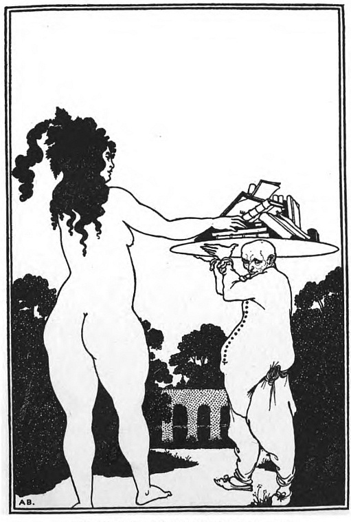 Beardsley is the satirist of an age without convictions, and he can but paint hell as Baudelaire did, without pointing for contrast to any contemporary paradise. He employs the same rhetoric as Baudelaire, a method of emphasis which it is uncritical to think insecure. In that terrible annunciation of evil which he called "The Mysterious Rose-Garden," the lantern-bearing angel with winged sandals whispers, from among the falling roses, tidings of more than "pleasant sins." The leering dwarfs, the "monkeys," by which the mystics symbolised the earthlier vices; those immense bodies swollen with the lees of pleasure, and those cloaked and masked desires shuddering in gardens and smiling ambiguously at interminable toilets; are part of a symbolism which loses nothing by lack of emphasis. And the peculiar efficacy of this satire is that it is so much the satire of desire returning upon itself, the mockery of desire enjoyed, the mockery of desire denied. It is because he loves beauty that beauty's degradation obsesses him; it is because he is supremely conscious of virtue that vice has power to lay hold upon him. And, unlike those other acceptable satirists of our day, with whom satire exhausts itself in the rebuke of a drunkard leaning against a lamp-post, or a lady paying the wrong compliment in a drawing-room, he is the satirist of essential things; it is always the soul, and not the body's discontent only, which cries out of these insatiable eyes, that have looked on all their lusts, and out of these bitter mouths, that have eaten the dust of all their sweetness, and out of these hands, that have laboured delicately for nothing, and out of these feet, that have run after vanities. They are so sorrowful because they have seen beauty, and because they have departed from the line of beauty.
