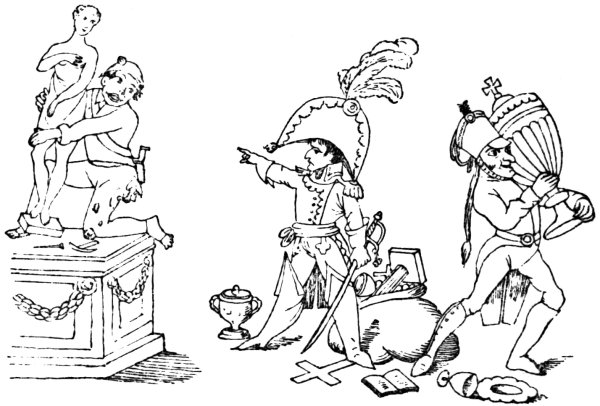 | NAPOLEON DESPOILS ITALY OF HER WORKS OF ART—THE SIEGE OF MANTUA—WÜRMSER’S SURRENDER—EARLIEST ENGLISH CARICATURE OF NAPOLEON—INVASION OF ENGLAND—LANDING IN PEMBROKESHIRE—NELSON’S RECEIPT TO MAKE AN OLLA PODRIDA—‘THE ARMY OF ENGLAND’ | 48 |