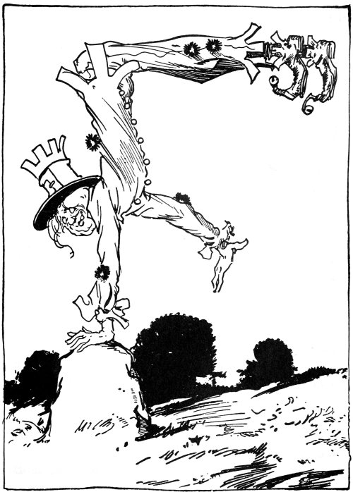 Even a hawk has to fly high in order to cross the Deadly Desert, from which poisonous fumes are constantly rising. Kiki Aru felt sick and faint by the time he reached good land again, for he could not quite escape the effects of the poisons. But the fresh air soon restored him and he alighted in a broad table-land which is called Hiland. Just beyond it is a valley known as Loland, and these two countries are ruled by the Gingerbread Man, John Dough, with Chick the Cherub as his Prime Minister. The Hawk merely stopped here long enough to rest, and then he flew north and passed over a fine country called Merryland, which is ruled by a lovely Wax Doll. Then, following the curve of the Desert, he turned north and settled on a tree-top in the Kingdom of Noland.