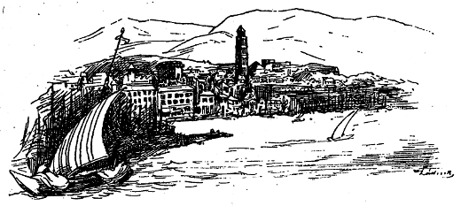 Unterdessen waren wir auf die Marine gekommen, von welcher der breite Schatten gewichen war, da die Sonnenstrahlen sich jetzt kräftig und heiss über dieselbe legten. Das Meer wippte in zitternder Bewegung vor einer stetigen Landbrise und die »Colombina« tanzte mit den anderen Barken gar lustig vor unseren Augen. Der Ante Placibat war auf einem als Landungsbrücke dienenden Brette an Bord gegangen und hantirte mit den Kisten, Fässern und Ballen herum, die auf dem Verdeck lagen, und der Mozzo hockte bei einem kleinen am Bug des Schiffes angemachten Kohlenfeuer um Kaffee zu kochen.