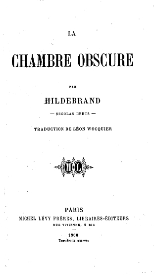 Il y a plusieurs années déjà que parut en Hollande, sous le titre de Camera obscura, un livre qui ne tarda pas à obtenir un succès considérable. Les deux premières éditions se succédèrent à six mois d'intervalle; les deux dernières datent de 1853 et 1854. Dans celles-ci surtout, l'œuvre primitive s'est accrue de pages nouvelles, et a un tiers environ de plus que lors de sa première apparition. Camera obscura renferme une série de tableaux de mœurs, de croquis, de fantaisies empruntés à la vie hollandaise. Le livre est signé Hildebrand, pseudonyme sous lequel se cache (ce n'est un mystère pour personne) un des plus grands poëtes de la Hollande, et le livre même nous autorise à ajouter, un des observateurs les plus fins, un des esprits les plus délicats de la grande famille littéraire: M. Nicolas Beets. Il naquit à Harlem, le 13 septembre 1814. Son père était un chimiste qui eut de la réputation et écrivit sur la science qui était sa spécialité divers ouvrages intéressants. Nicolas Beets a eu une existence calme, paisible et peu accidentée. Après avoir fait ses études à l'université de Leyde, il fut promu au doctorat en théologie, et l'année suivante s'accomplirent pour lui deux événements importants: il épousa mademoiselle Adélaïde de Foreest, petite-fille, par son père, de l'illustre Van der Palm, l'une des gloires de l'université de Leyde, un des hommes les plus éloquents de son siècle, et le dernier prosateur vraiment classique de la littérature néerlandaise. La même année, M. Beets fut nommé pasteur à Heemstede, village considérable situé dans les riants environs de Harlem; il y demeura pendant près de quatorze années, s'occupant avec un zèle vraiment évangélique des devoirs de sa charge. Il passa ensuite en la même qualité à Middelbourg, et c'est là que lui fut offerte, à deux reprises différentes, la chaire de théologie de Stellenbrek, au cap de Bonne-Espérance. Il refusa chaque fois cette mission, et fut nommé en 1854 pasteur à Utrecht, fonctions qu'il occupe encore à l'heure qu'il est.