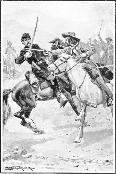 On reaching this they saw across the river and the flat ground beyond, riding down a little ridge, a column of horsemen trotting towards them. Horsemen at full trot! Then they could not be any of their men, for their horses could not trot to save their lives.