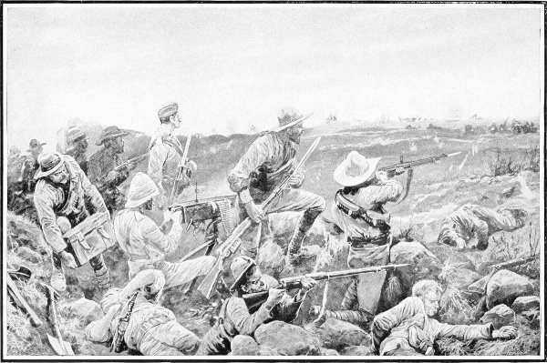 The Devons had climbed up the hill late in the afternoon to avenge their fallen comrades. They had charged straight up the hill in a line, but a deadly fire at short range brought down dozens of them as they rushed the top. However, there was no wavering in the Devons, but they pressed forward at the double with the steel advanced, and only a few Boers waited for that disagreeable operation in war. There was a terrific hailstorm going on as Colonel Park halted his men just below the crest: it was a moment to try the nerves of the strongest. Once over that lip of hillside and a fiercer storm than hail would meet them in the face, and call many of them to their last account. No wonder many a hand went for the water-bottle, and little nervous tricks of foot and hand betrayed the tension of the moment.