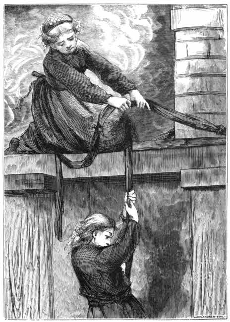 “It’s very well to say drop them; but it’s just as much as I can do to keep from falling myself. Don’t you see I’m holding on with both hands?”