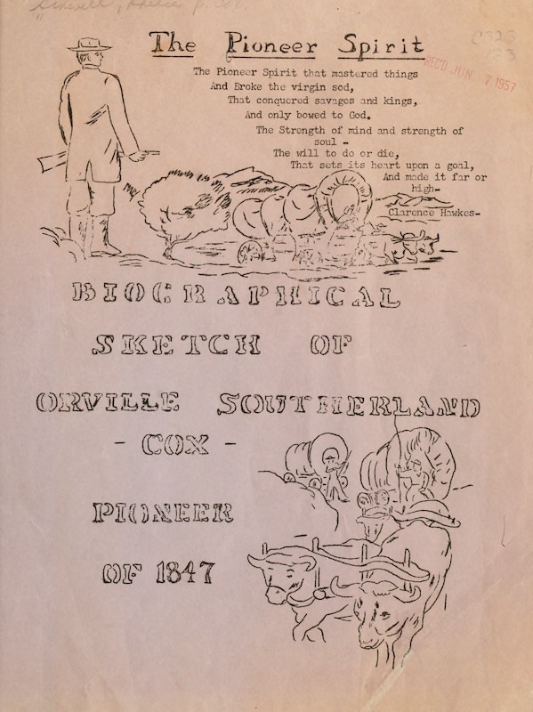 Biographical sketch of Orville Southerland Cox, Pioneer of 1847, partly from a sketch written by Adelia B. Cox Sidwell for the "Daughters of the Pioneers", Manti, Utah, 1913.
