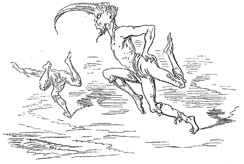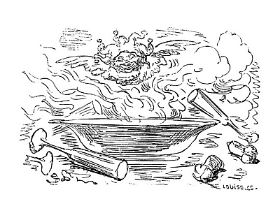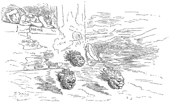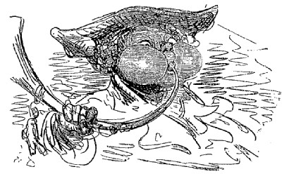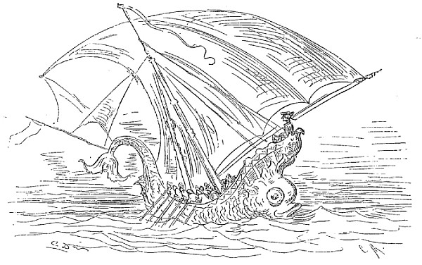 Quand nous eûmes erré trois jours durant, Dieu sait où,—car nous manquions toujours de boussole,—nous arrivâmes dans une mer qui semblait toute noire: nous goûtâmes ce que nous prenions pour de l'eau sale, et nous reconnûmes que c'était de l'excellent vin! Nous eûmes toutes les peines du monde à empêcher nos matelots de se griser. Mais notre joie ne fut pas de longue durée, car, quelques heures après, nous nous trouvâmes entourés de baleines et d'autres poissons non moins gigantesques: il y en avait un d'une longueur si prodigieuse que même avec une lunette d'approche nous n'en pûmes voir le bout. Malheureusement nous n'aperçûmes le monstre qu'au moment où il était tout près de nous: il avala d'un trait notre bâtiment avec ses mâts dressés et toutes ses voiles dehors.
