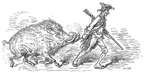 Si dangereux que soit cet animal, le sanglier est encore plus redoutable et plus féroce. J'en rencontrai un jour un dans une forêt, dans un moment où je n'étais préparé ni à la défense ni à l'attaque. J'avais à peine eu le temps de me réfugier derrière un arbre, que l'animal se jeta sur moi de tout son élan, pour me donner un coup de côté; mais, au lieu de m'entrer dans le corps, ses défenses pénétrèrent si profondément dans le tronc, qu'il ne put les retirer pour fondre une seconde fois sur moi.