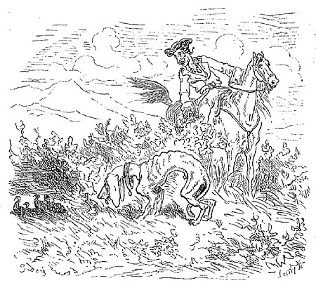 Étant dès lors bien assuré que les deux parties de mon cheval étaient vivantes, j'envoyai chercher notre vétérinaire. Sans perdre de temps, il les rajusta au moyen de rameaux de laurier qui se trouvaient là, et la blessure guérit heureusement. Il advint alors quelque chose qui ne pouvait arriver qu'à un animal aussi supérieur. Les branches prirent racine dans son corps, poussèrent, et formèrent autour de moi comme un berceau à l'ombre duquel j'accomplis plus d'une action d'éclat.