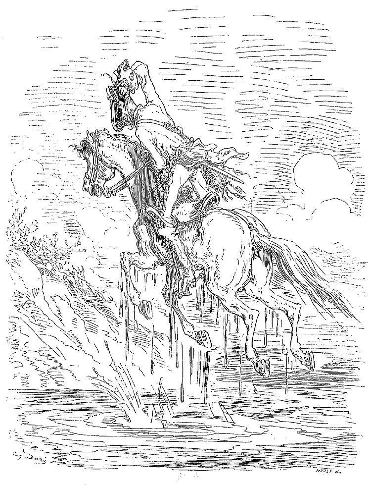 Comment cela était-il arrivé? je ne pouvais m'en rendre compte, lorsqu'enfin mon hussard arriva du côté opposé à celui par lequel j'étais venu et, à travers un torrent de cordiales félicitations et d'énergiques jurons, me rapporta ce qui suit. Tandis que je m'étais jeté pêle-mêle au milieu des fuyards, on avait brusquement laissé retomber la herse de la porte, qui avait tranché net l'arrière-train de mon cheval. Cette seconde partie de ma bête était d'abord restée au milieu des ennemis et y avait exercé de terribles ravages; puis, ne pouvant pénétrer dans la ville, elle s'était dirigée vers un pré voisin, où je la retrouverais sans aucun doute. Je tournai bride aussitôt, et l'avant de mon cheval me mena au grand galop vers la prairie. A ma grande joie, j'y retrouvai en effet l'autre moitié qui se livrait aux évolutions les plus ingénieuses et passait gaiement le temps avec les juments qui erraient sur la pelouse.