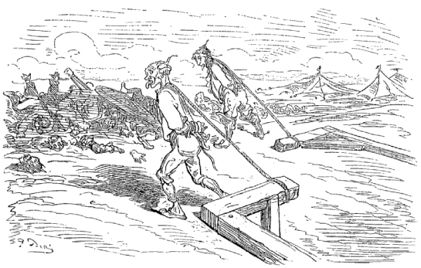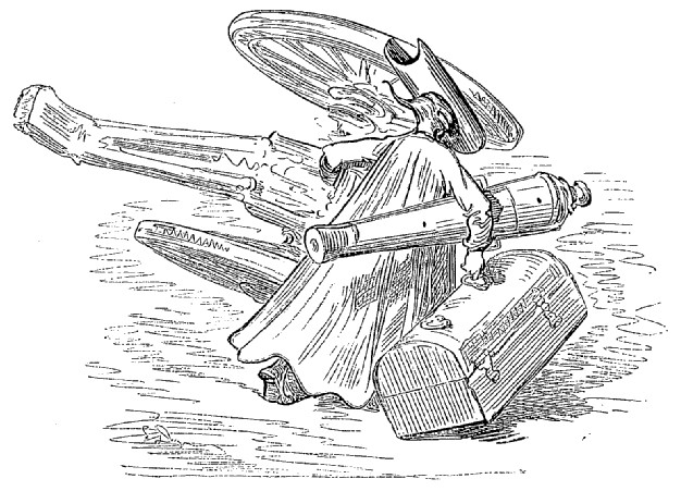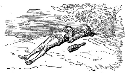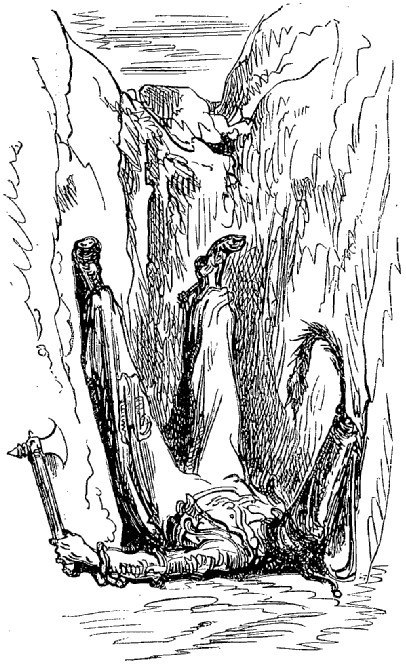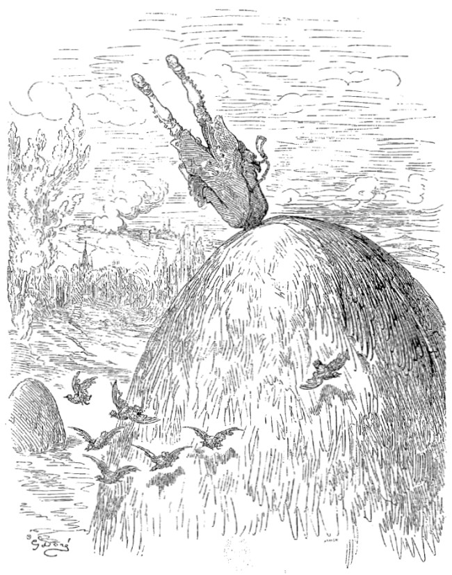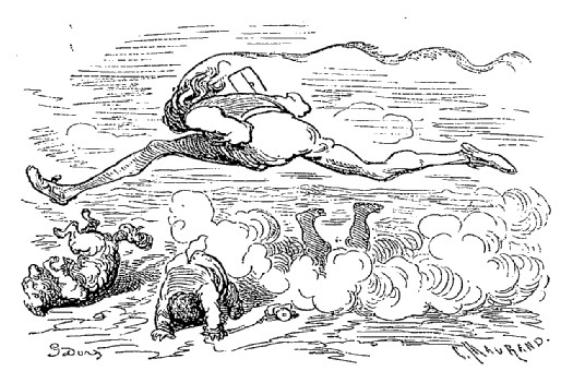 Je pouvais bien être encore à une distance de deux lieues de la terre, dans les nuages, lorsque la corde se cassa, et je tombai si rudement sur le sol, que j'en restai tout étourdi. Mon corps, dont le poids s'était accru par la vitesse acquise et par la distance parcourue, creusa dans la terre un trou d'au moins neuf pieds de profondeur. Mais la nécessité est bonne conseillère. Je me taillai avec mes ongles de quarante ans une sorte d'escalier, et je parvins de cette façon à revoir le jour.