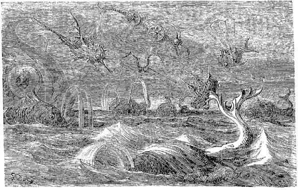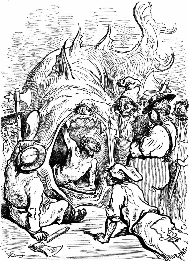 Après que nous eûmes passé quelque temps dans sa gueule, il la rouvrit pour engloutir une énorme masse d'eau: notre navire, soulevé par ce courant, fut entraîné dans l'estomac du monstre, où nous nous trouvions comme si nous eussions été à l'ancre pris d'un calme plat. L'air était, il faut en convenir, chaud et lourd. Nous vîmes dans cet estomac des ancres, des câbles, des chaloupes, des barques et bon nombre de navires, les uns chargés, les autres vides, qui avaient subi le même sort que nous. Nous étions obligés de vivre à la lumière des torches; il n'y avait plus pour nous ni soleil, ni lune, ni planètes. Ordinairement nous nous trouvions deux fois par jour à flot et deux fois à sec. Quand la bête buvait nous étions à flot, lorsqu'elle lâchait l'eau nous étions à sec. D'après les calculs exacts que nous fîmes, la quantité d'eau qu'elle avalait à chaque gorgée eût suffi à remplir le lit du lac de Genève, dont la circonférence est de trente milles.