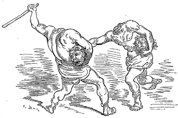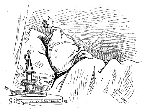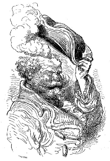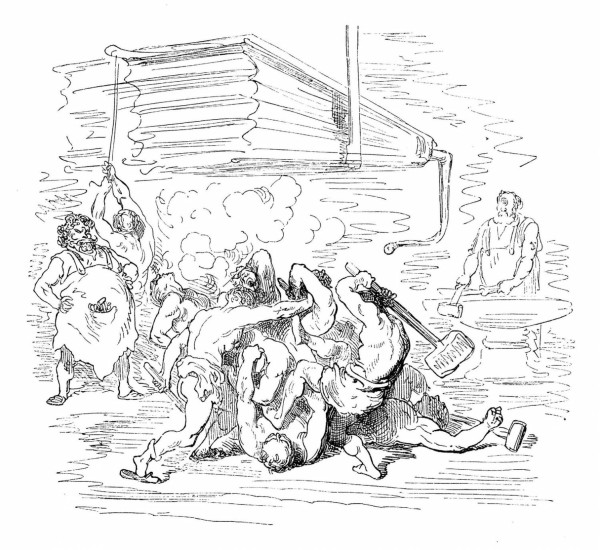 Mais quelle que fût la violence avec laquelle s'élançaient les matières incandescentes, je descendais plus rapidement qu'elles ne montaient, grâce à la loi de la pesanteur, et au bout de quelques instants je touchai le fond. La première chose que je remarquai fut un bruit épouvantable, un concert de jurements, de cris et de hurlements qui semblaient s'élever autour de moi. J'ouvris les yeux, et qu'est-ce que je vis?... Vulcain en personne accompagné de ses cyclopes. Ces messieurs, que mon bon sens avait depuis longtemps relégués dans le domaine de la fiction, étaient depuis trois semaines en querelle au sujet d'un article du règlement intérieur, et c'était cette dispute qui remuait la surface externe. Mon apparition rétablit comme par enchantement la paix et la concorde dans la tapageuse assemblée.