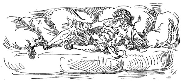 Vulcain courut aussitôt clopin-clopant vers son armoire, en tire des onguents et des emplâtres qu'il m'appliqua de sa propre main, et, quelques minutes après, mes blessures étaient guéries. Il m'offrit ensuite des rafraîchissements, un flacon de nectar et d'autres vins précieux, comme n'en boivent que les dieux et les déesses. Dès que je fus à peu près remis, il me présenta à Vénus, son épouse, en lui recommandant de me prodiguer tous les soins qu'exigeait ma position. La somptuosité de la chambre où elle me conduisit, le moelleux du sofa sur lequel elle me fit asseoir, le charme divin qui régnait dans toute sa personne, la tendresse de son cœur, il n'y a pas de mots dans les langues terrestres pour exprimer cela; rien que dépenser, la tète me tourne!