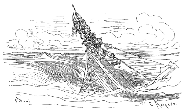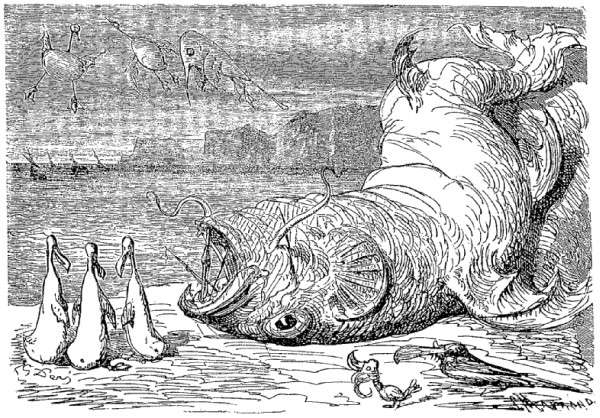 Dès que nous fûmes à flot, nous armâmes les chaloupes qui nous remorquèrent et nous ramenèrent dans le monde. Ce fut avec une joie inexprimable que nous revîmes la lumière du soleil dont nous avions été privés pendant ces quinze jours de captivité. Lorsque tout le monde fut sorti de ce vaste estomac, nous formions une flotte de trente-cinq navires de toutes les nations. Nous laissâmes nos deux mâts plantés dans la gorge du poisson, pour préserver d'un accident semblable au nôtre ceux qui se trouveraient entraînés vers ce gouffre.